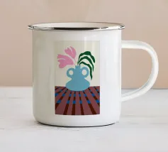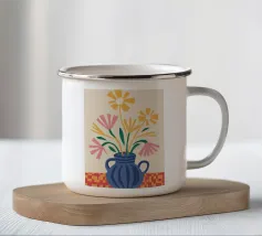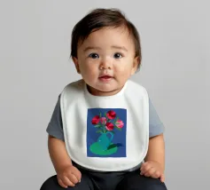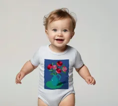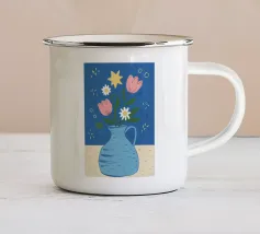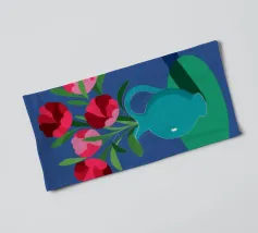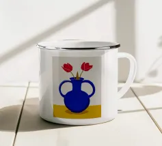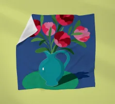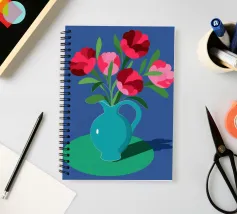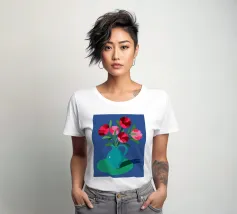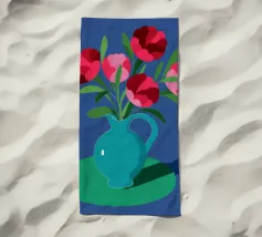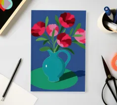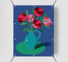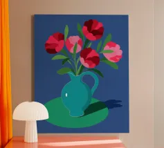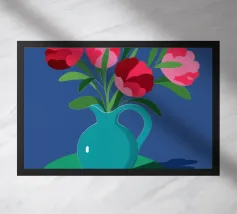 Una suggestiva natura morta con un bouquet di fiori rosa e rossi in una bella brocca blu turchese. La composizione semplice su uno sfondo blu scuro fa risaltare i colori vivaci dei fiori.
