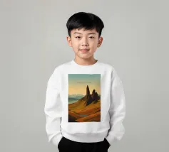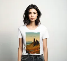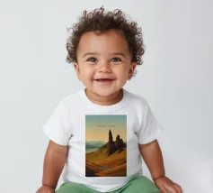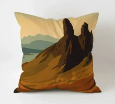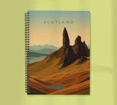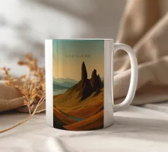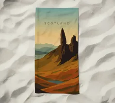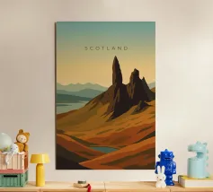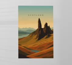 Disegno di viaggio minimalista della Scozia con il famoso monte Old Man of Storr sulla penisola dell'Isola di Skye, in Scozia. Questo motivo tipico del paesaggio scozzese è perfetto per tutti i viaggiatori che amano il paesaggio aspro delle regioni montuose della Scozia.