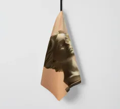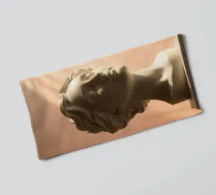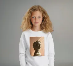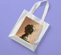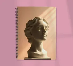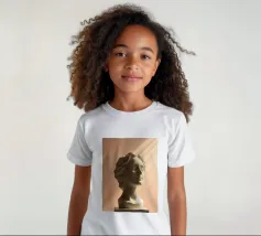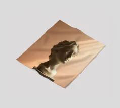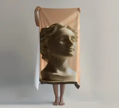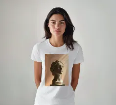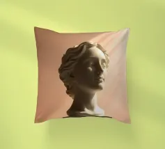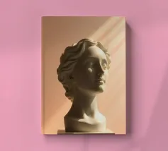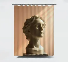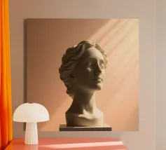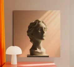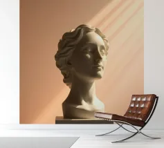 Il busto in marmo bianco di una donna serena è elegantemente collocato su un piedistallo. La luce soffusa del sole filtra e proietta ombre delicate sullo sfondo beige, creando un'atmosfera tranquilla.