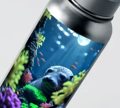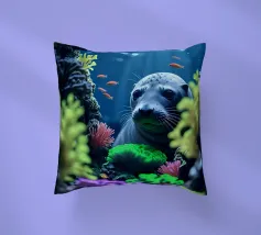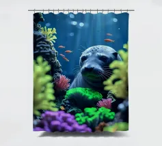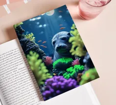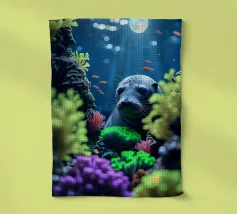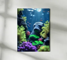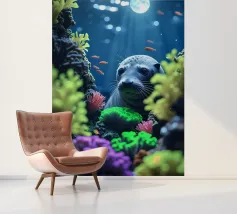 Immersa nella luce della luna, una foca guarda da una barriera corallina vibrante. Coralli radiosi brillano mentre pesci dorati volteggiano dolcemente nell'immobilità della notte.