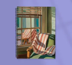 Una poltrona a righe si trova in una stanza accanto a una finestra con tende, con la luce del sole che entra e crea bellissimi motivi di luce e ombra. La scena è calda e tranquilla e cattura un perfetto pomeriggio di ozio.