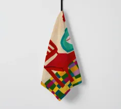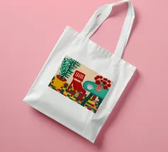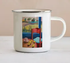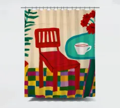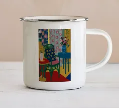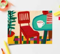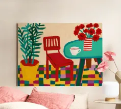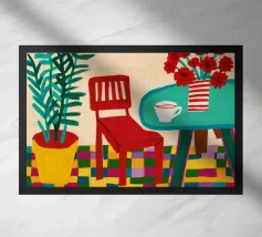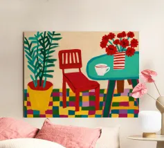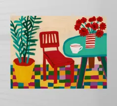Una scena d'interni con due sedie, una con motivo a righe rosse e verdi e l'altra a scacchi. Un tavolo rosso con una tazza di caffè e un vaso di fiori riunisce la composizione in un'armonia giocosa e colorata.