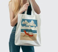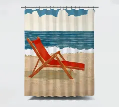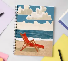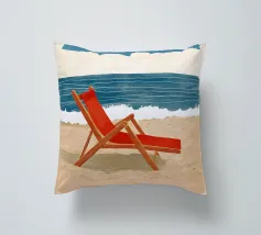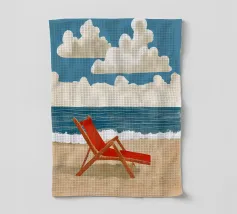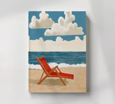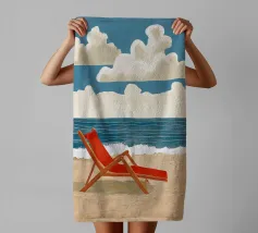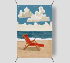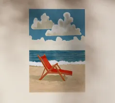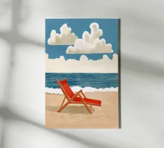 L'immagine irradia puro idillio estivo: Una sedia a sdraio rossa campeggia sulla spiaggia, incorniciata dalle dolci onde del mare e da un cielo dipinto da grandi nuvole bianche.