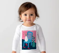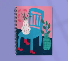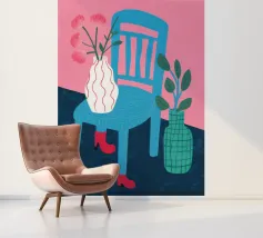 Un'affascinante ed eccentrica natura morta con una pianta in vaso appoggiata su una sedia blu brillante. La composizione è semplice ma piena di carattere, con colori vivaci e uno stile giocoso.