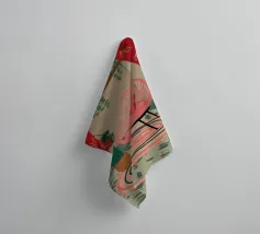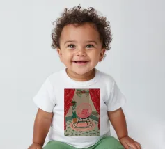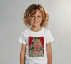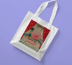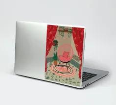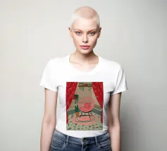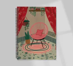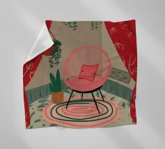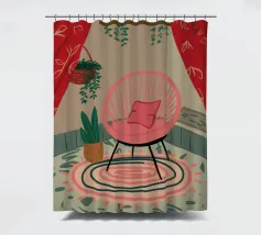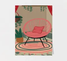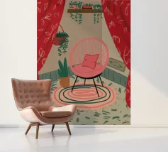 L'illustrazione di una scena interna mostra un'unica sedia rosa sotto una scenografica tenda rossa, con una pianta nelle vicinanze, evocando un senso di elegante solitudine e teatralità.