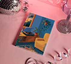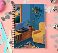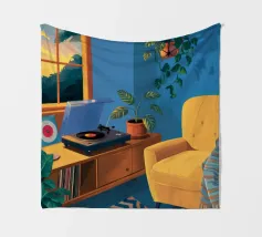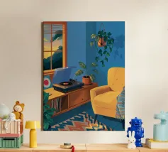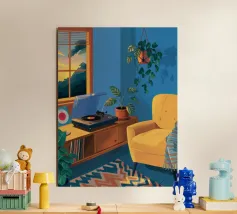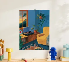 Un angolo accogliente di una stanza al tramonto, con una poltrona gialla, un giradischi su un tavolino e una pianta in vaso. La vista attraverso la finestra mostra un cielo crepuscolare, creando un'atmosfera fresca, rilassata e musicale.