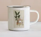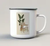 Illustrazione elegante e minimalista di una poltrona moderna accanto a una pianta alta e frondosa in vaso, su uno sfondo beige neutro, che crea un angolo sereno ed elegante.
