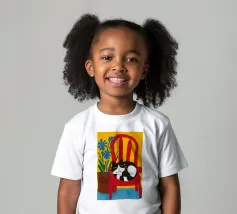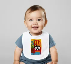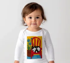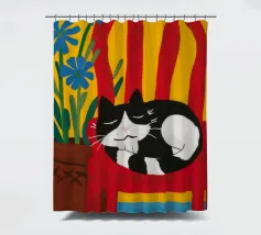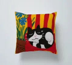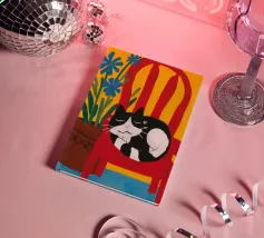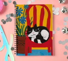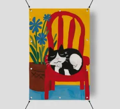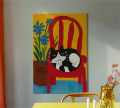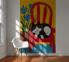 Un'affascinante illustrazione di un gatto bianco e nero che si accoccola e dorme pacificamente su una sedia rossa brillante. La semplice composizione è un'ode dolce, accogliente e commovente alla felicità felina.