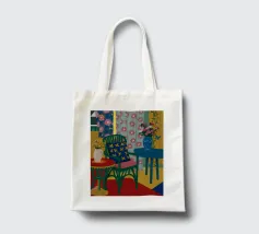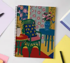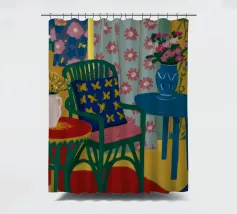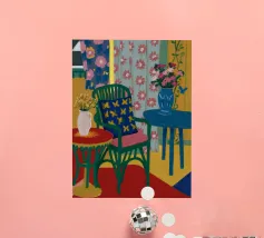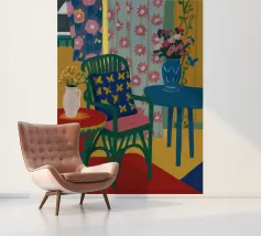 Natura morta di un bouquet di fiori su una sedia con motivo a stelle, ambientata in una stanza blu. La composizione è affascinante, stravagante e ha una qualità magica, da notte stellata.