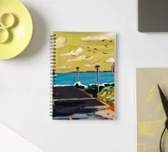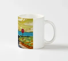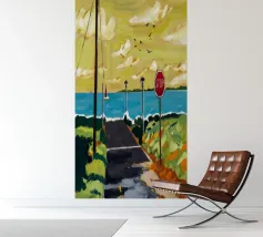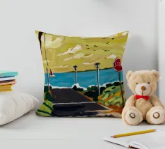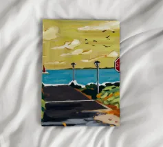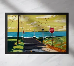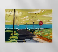 Un segnale di stop si trova su una tranquilla strada costiera, con una barca a vela sullo sfondo, creando un'eccentrica giustapposizione di regole del traffico e libertà balneare.