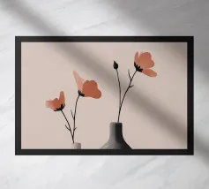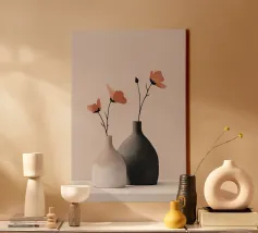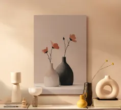 Eleganti papaveri in morbide tonalità terrose adornano due vasi in ceramica e donano un tocco armonioso a qualsiasi ambiente con il loro stile boho minimalista. Questa illustrazione floreale celebra la bellezza della natura e dell'arte moderna.