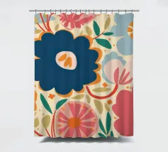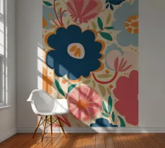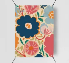 Un grande fiore blu stilizzato si staglia su uno sfondo caldo e neutro, creando un'opera d'arte botanica semplice, elegante e moderna.
