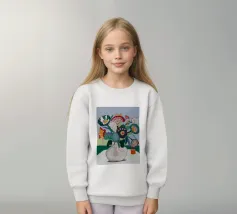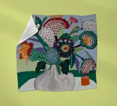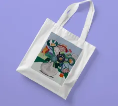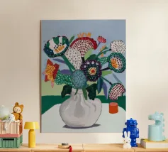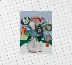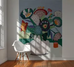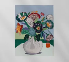 Una natura morta stilizzata di fiori colorati con motivi unici e centri neri in un semplice vaso bianco, su uno sfondo blu chiaro che evoca un'atmosfera grafica e retrò.