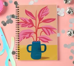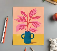 Un'illustrazione semplice ma d'effetto di una pianta dalle foglie rosa in un audace vaso blu su uno sfondo caldo, che celebra la bellezza del colore e della forma botanica minimalista.