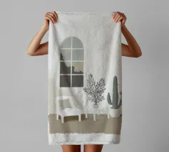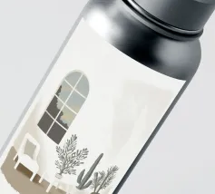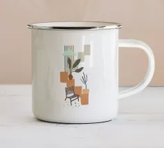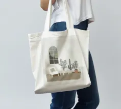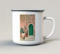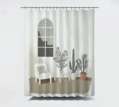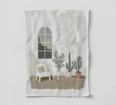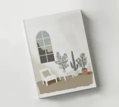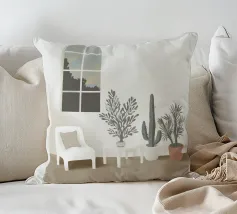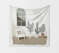 Questa illustrazione minimalista mostra un'elegante stanza boho con cactus e vasi di fiori in tenui colori pastello. Le nuvole fanno capolino dalla finestra, mentre un tavolo e una bella sedia sottolineano il fascino dell'arredamento. Perfetto per l'estate, questo dipinto grafico porta un tocco di natura in ogni casa.