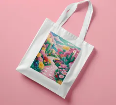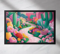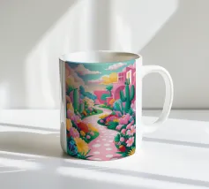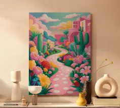 Un paesaggio stravagante con un sentiero rosa a pois che si snoda in un mondo fantastico di cactus e colline stilizzate sotto un cielo pastello.