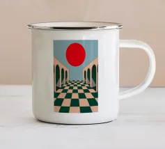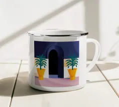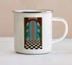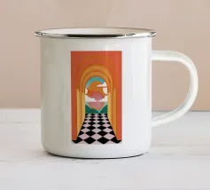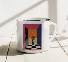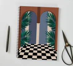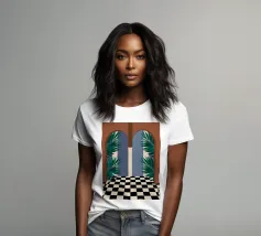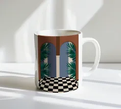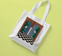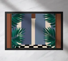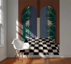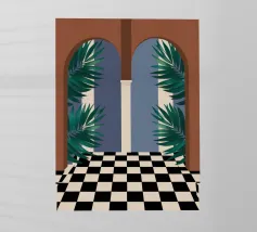 Una vista elegante e intrigante attraverso due porte ad arco, che conduce a una stanza con un audace pavimento a scacchi bianchi e neri, affiancato da piante rigogliose. La composizione crea un senso di profondità e di elegante mistero.