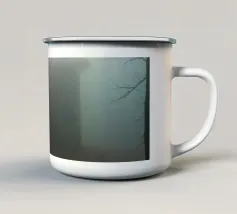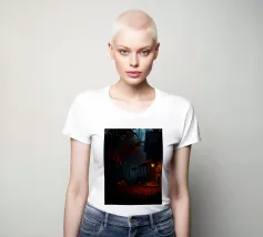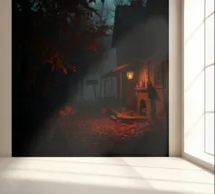 Una baita scarsamente illuminata si trova in una foresta al crepuscolo, circondata da un'atmosfera nebbiosa. Il bagliore di una lanterna proietta una luce calda sulla veranda, mettendo in risalto le foglie cadute.