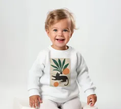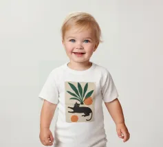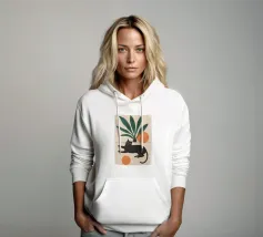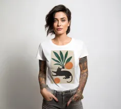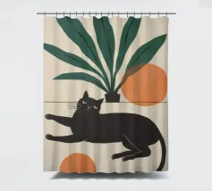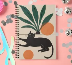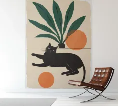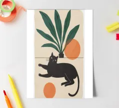 Una composizione serena con un elegante gatto nero che riposa vicino a una semplice pianta in vaso, con un audace cerchio arancione che aggiunge un tocco di calore moderno e astratto alla scena.