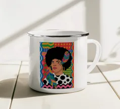 Questa opera d'arte raffigura una persona seduta in una stanza colorata che indossa abiti a righe. Lo sfondo comprende varie piante e mobili, creando un ambiente accogliente e sereno.