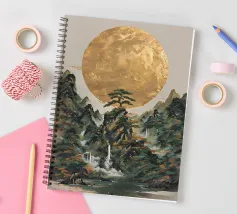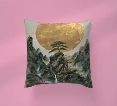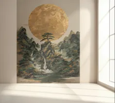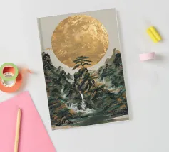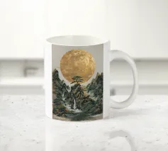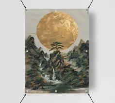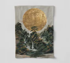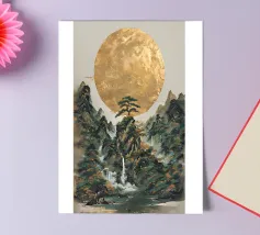 Un sereno paesaggio dipinto con una maestosa luna dorata che sorge su montagne verdeggianti. Un pino solitario si erge in cima a uno sperone roccioso, con vista sulle cascate e su un lago tranquillo. L'opera evoca un senso di tranquillità e armonia con la natura.