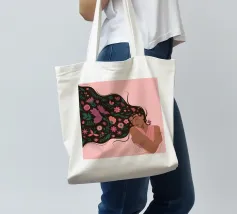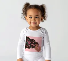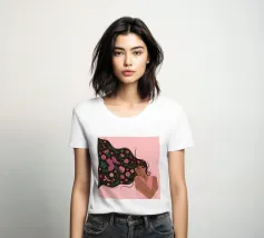 Questa opera d'arte raffigura una persona con lunghi e fluenti capelli ornati di fiori, sdraiata su uno sfondo rosa. L'espressione serena e gli elementi floreali creano un'atmosfera pacifica e sognante.