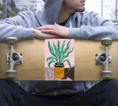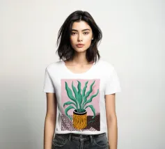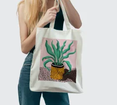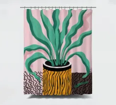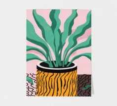 Una vivace pianta d'appartamento verde con grandi foglie fluenti si trova in un vaso a motivi gialli e neri su uno sfondo rosa tenue, creando un'illustrazione botanica moderna ed elegante.