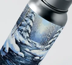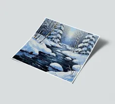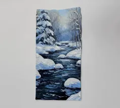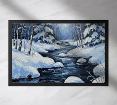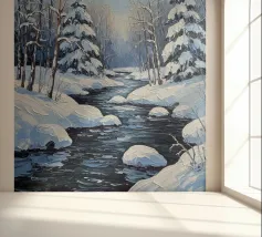 Questo splendido dipinto a olio, realizzato a mano, cattura la tranquilla bellezza di un paesaggio invernale. Un tranquillo ruscello, le cui acque scure riflettono il cielo pallido, serpeggia in una foresta innevata. Le pennellate spesse e impastate danno vita alla scena, creando un effetto tridimensionale sulle pesanti coltri di neve ammassate sulle rive del fiume e sui pini. I blu profondi e i bianchi freddi della neve contrastano magnificamente con i rami spogli e scheletrici degli alberi circostanti. Quest'opera invita a sentire l'aria frizzante dell'inverno e il dolce mormorio dell'acqua.