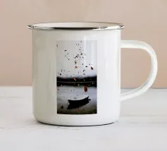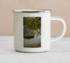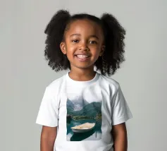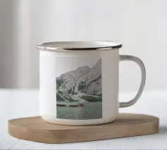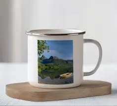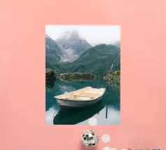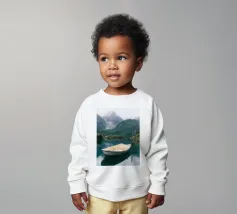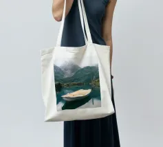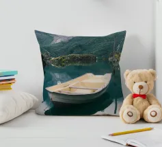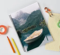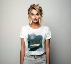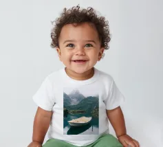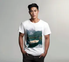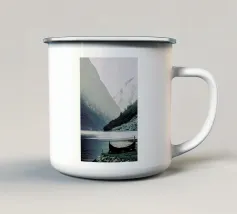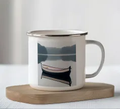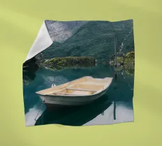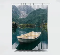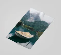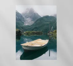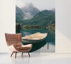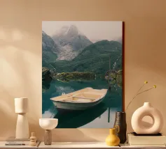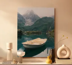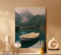 Una barca solitaria riposa pacificamente su un lago di montagna cristallino, circondato da cime imponenti e avvolte dalla nebbia e da una vegetazione lussureggiante. L'acqua a specchio riflette la bellezza senza tempo del paesaggio, creando una scena che sembra non essere stata intaccata dal tempo. Perfetto per portare calma e ispirazione in qualsiasi ambiente.