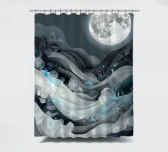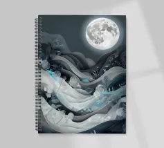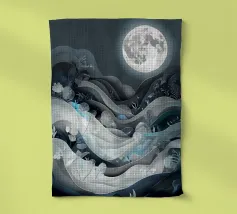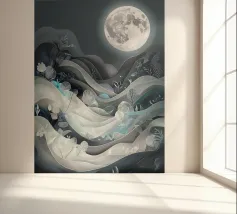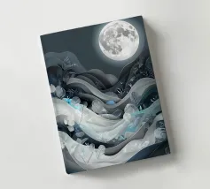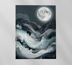 Questa accattivante opera d'arte raffigura una tranquilla scena notturna, con una luminosa luna piena che proietta il suo bagliore etereo su un paesaggio di dolci colline, piante delicate e un ruscello scintillante. L'intricato disegno papercut aggiunge un tocco di eleganza e profondità alla composizione, creando un senso di pace e serenità.