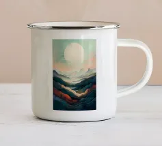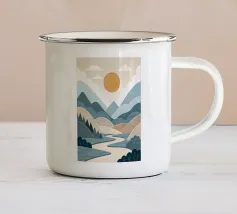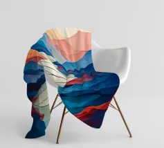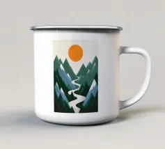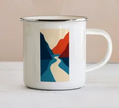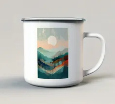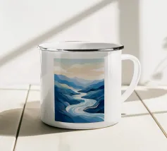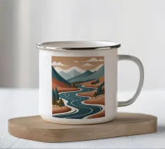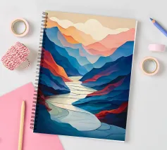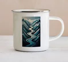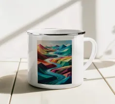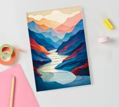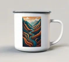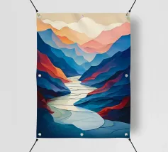 Un dipinto paesaggistico vibrante e astratto di un fiume tortuoso che scorre attraverso una maestosa catena montuosa. I colori audaci e le forme geometriche creano un'opera di grande impatto visivo e accattivante.
