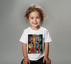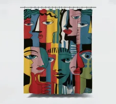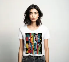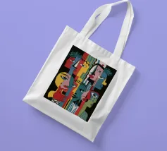 Una composizione astratta di volti o maschere multiple sovrapposte, resa in uno stile che ricorda il cubismo o l'arte tribale. L'opera utilizza colori decisi come il nero, il giallo, il blu, il rosso e il verde, con contorni ben definiti.