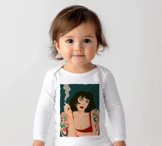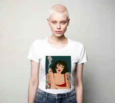 Un ritratto sorprendente e tagliente di una donna con intricati tatuaggi sul braccio, che fuma una sigaretta. Lo sguardo diretto e l'atteggiamento sicuro creano un'immagine potente di una femminilità moderna e non omologata.