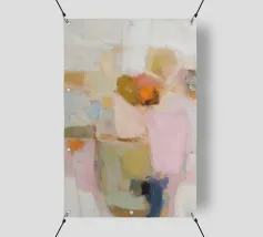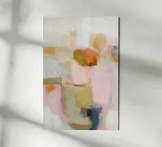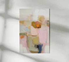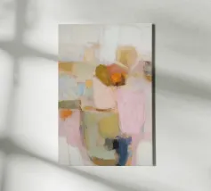 Quest'opera d'arte astratta dai tenui colori pastello cattura un'atmosfera calma e armoniosa. Le morbide pennellate e le tenui tonalità di beige, azzurro e rosa conferiscono al dipinto un'eleganza moderna e minimalista che si adatta perfettamente a qualsiasi casa contemporanea.
