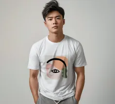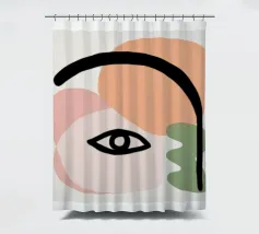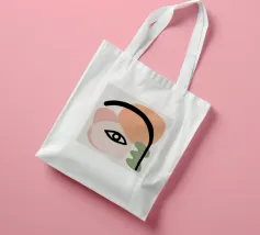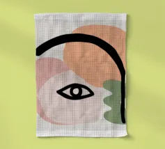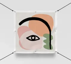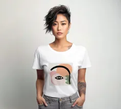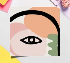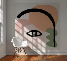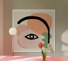 Un occhio astratto è annidato all'interno di forme organiche sovrapposte in rosa pastello, arancione e verde, creando una composizione morbida, sognante e moderna.