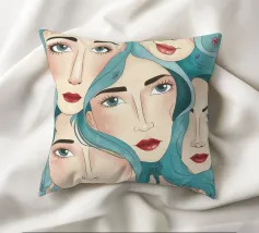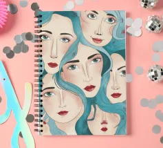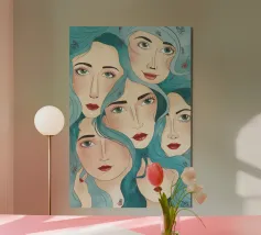 Un'avvincente composizione di più volti femminili diversi, che si sovrappongono e guardano in direzioni diverse, resa in uno stile illustrativo moderno che celebra la femminilità e la diversità.