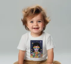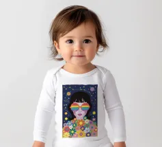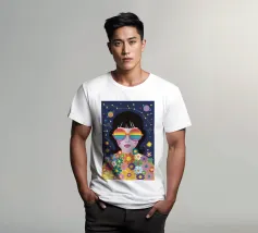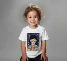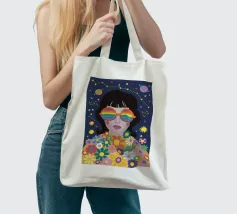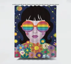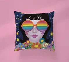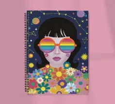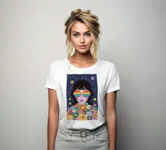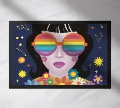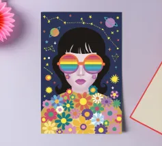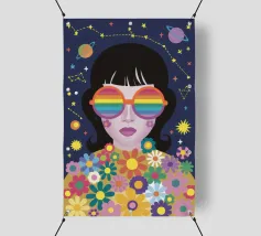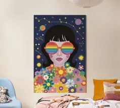 Ritratto di una donna con fiori colorati tra i capelli, che indossa occhiali da sole futuristici con lenti arcobaleno che riflettono un cielo stellato, mescolando temi cosmici e floreali in stile pop art.