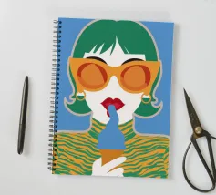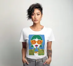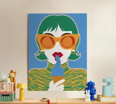 Un ritratto pop art audace ed elegante di una donna con capelli corti verdi, grandi occhiali da sole arancioni e un top a fantasia. La sua espressione sicura e la palette di colori vivaci creano una dichiarazione di moda chic e moderna.