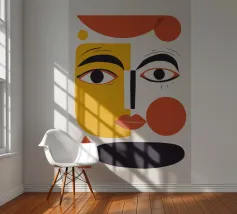 Un ritratto astratto vivace e audace con due occhi distinti, guance circolari rosse e tratti stilizzati. L'uso di giallo, arancione, rosso e nero su uno sfondo chiaro crea un personaggio vivace ed espressivo.