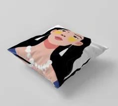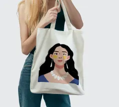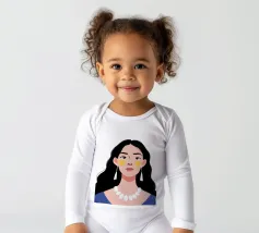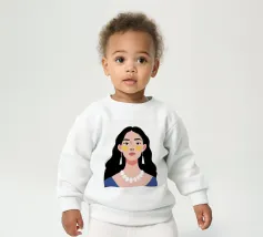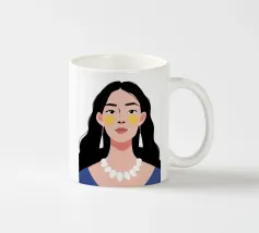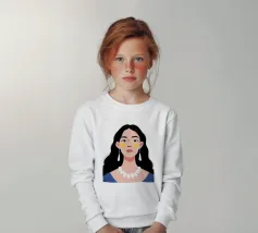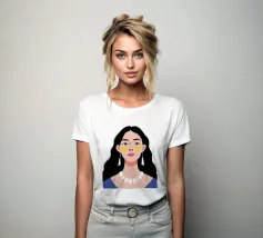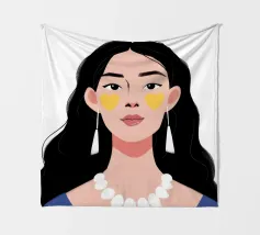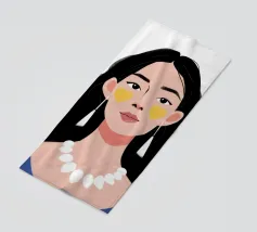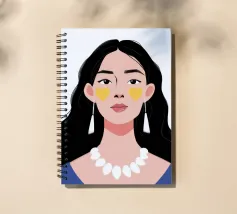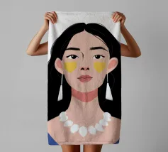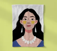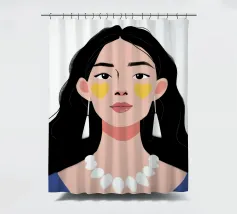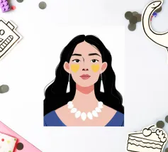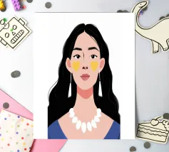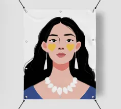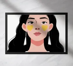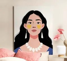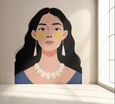 Un ritratto moderno e sorprendente di una donna con i capelli scuri, che indossa una collana di perle e delle macchie gialle sotto gli occhi. Il suo sguardo diretto e calmo crea un'immagine contemporanea che fonde la bellezza classica con i moderni rituali di cura di sé.