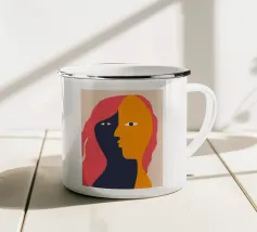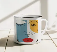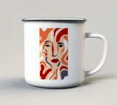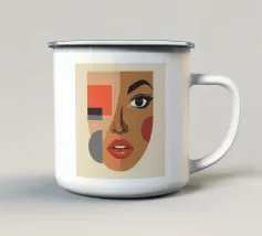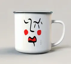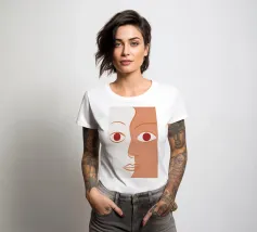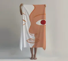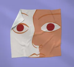 Un primo piano estremo di un volto è ridotto alle sue forme essenziali e minimaliste, con due espressivi occhi rosso-arancio che guardano direttamente lo spettatore da uno sfondo beige e astratto.