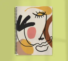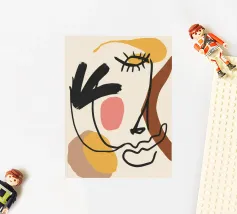 Un volto è reso con un rapido ed espressivo scarabocchio nero su forme astratte di terracotta, giallo e bianco, catturando un'espressione cruda e animata.