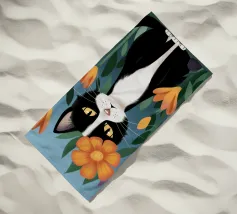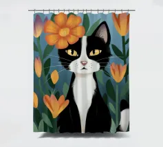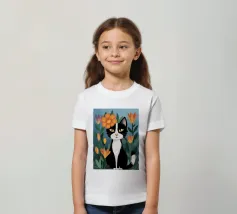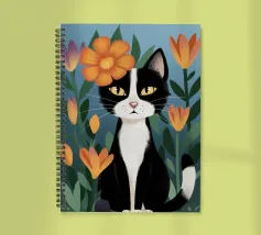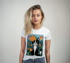 Un sorprendente ritratto di un gatto smoking bianco e nero con intensi occhi verdi, incorniciato da foglie rigogliose e da un fiore arancione. L'opera d'arte è una splendida e audace celebrazione della bellezza felina.