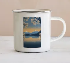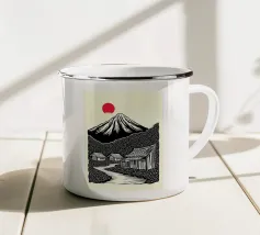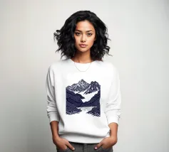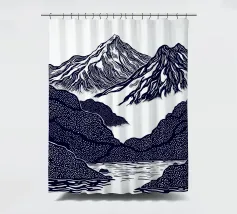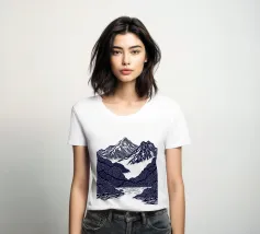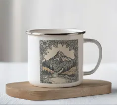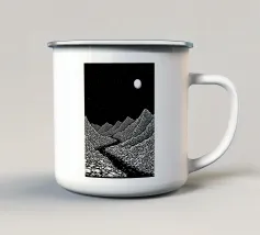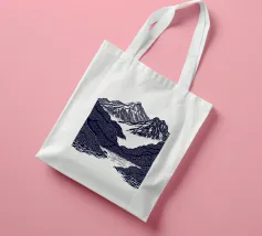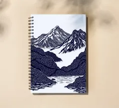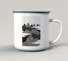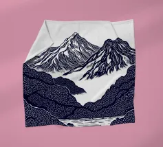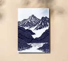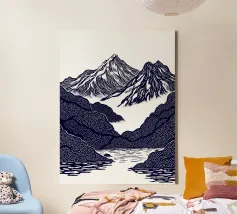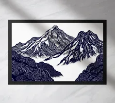 Un'audace e intricata illustrazione in stile linoleografico di un paesaggio montano, ispirata all'estetica giapponese. Cime innevate svettano su valli nebbiose, mentre uno specchio d'acqua calma riflette il terreno accidentato circostante. I dettagli raffinati e le texture ricche evocano un senso di tranquillità e atemporalità.
