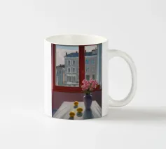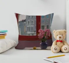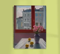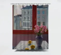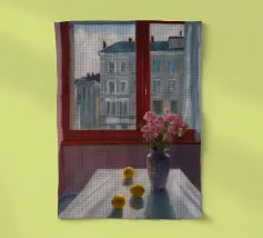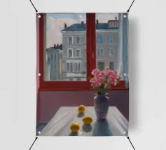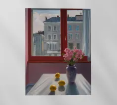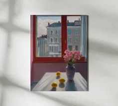 Un vaso di fiori rosa su un tavolo bianco immacolato riflette la delicata luce del mattino contro una finestra rossa, evocando una delicata pace.