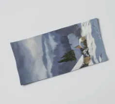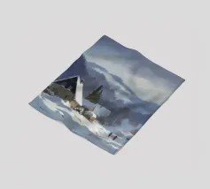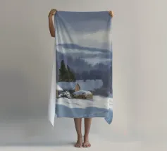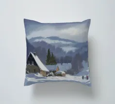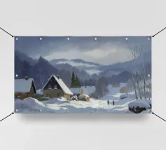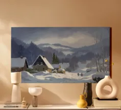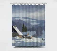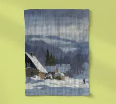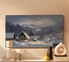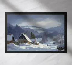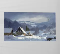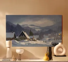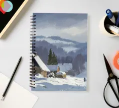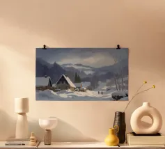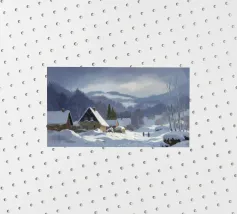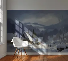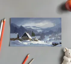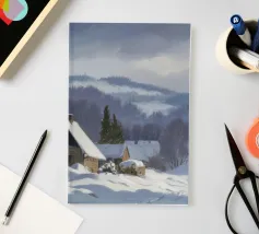 Un sereno paesaggio invernale che ritrae una baita innevata immersa tra alberi spogli sotto un cielo morbido e coperto, che trasmette l'atmosfera tranquilla e pacifica di un'appartata giornata invernale.