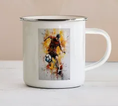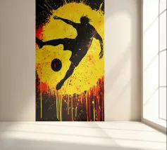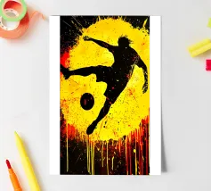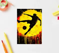 Un tiro in salto dinamico in silhouette, congelato al momento del contatto con la palla. Lo sfondo esplode in giallo, rosso e nero, pieno di energia e movimento.