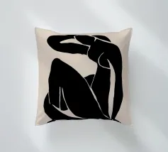 Elegante silhouette astratta di una persona seduta con un braccio sollevato dietro la testa e l'altro appoggiato sul ginocchio, catturata in nero pieno su uno sfondo beige. Le linee e la forma minimalista trasmettono un senso di contemplazione e relax.