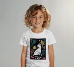 Un gatto bianco stilizzato siede in mezzo a un fogliame scuro e astratto, sotto un cielo scuro. Lo stile grafico ad alto contrasto conferisce alla scena una qualità mistica ed enigmatica.