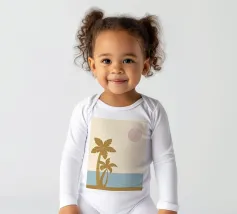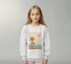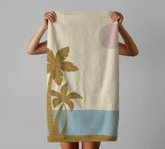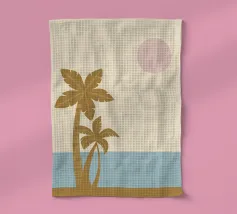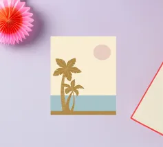 Un'illustrazione minimalista di una singola palma su una spiaggia, stagliata contro un grande sole pallido e un mare calmo, che crea un'atmosfera tropicale tranquilla e serena.